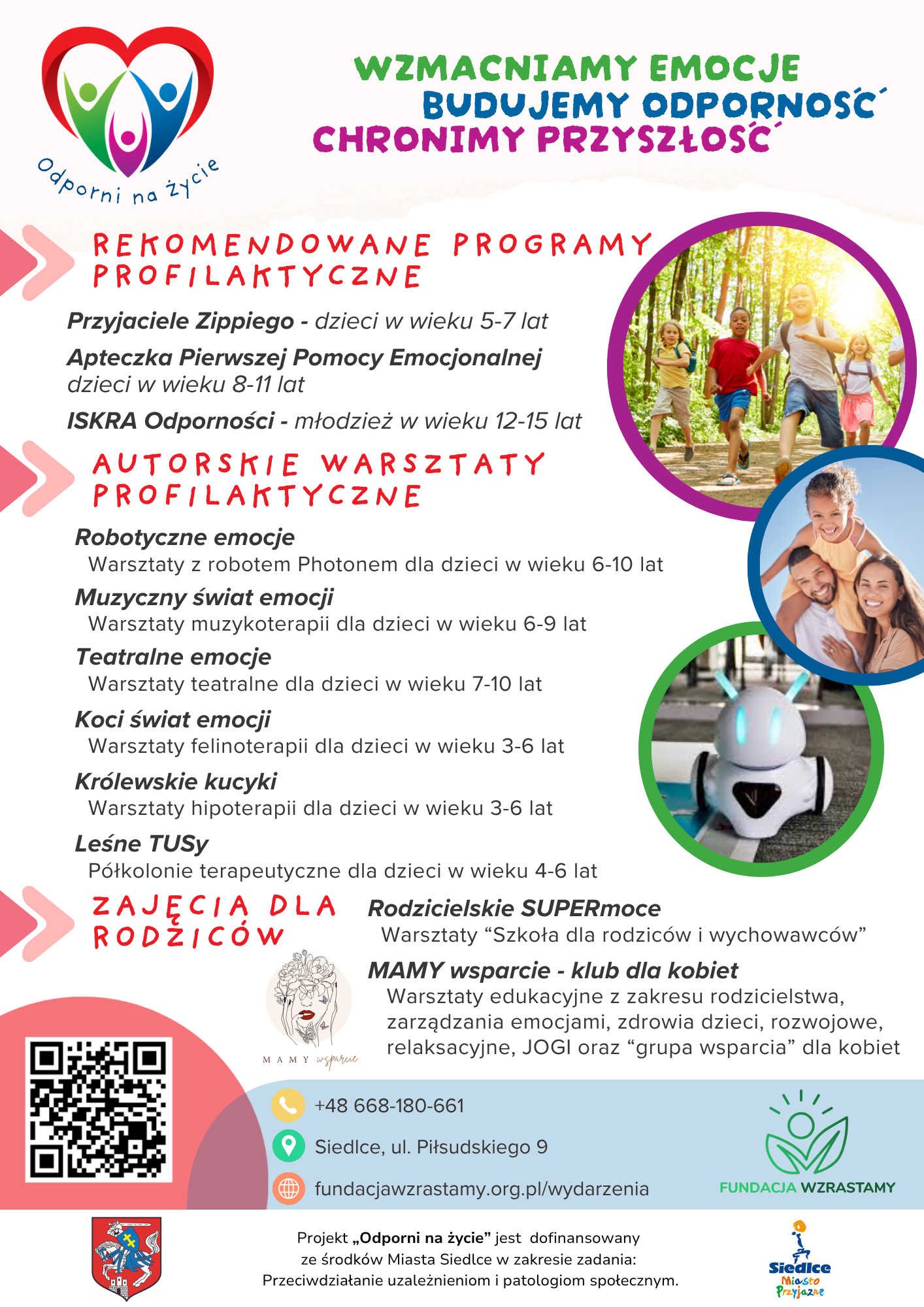 założeniach psychologii pozytywnej, uważności (mindfulness) oraz budowania zasobów osobistych. Celem programu jest wzmacnianie odporności psychicznej dzieci poprzez rozwijanie takich kompetencji jak: rozpoznawanie i nazywanie emocji, empatia, współpraca, optymizm, poczucie sprawczości oraz umiejętność radzenia sobie ze stresem i porażką. Zajęcia prowadzone są w formie warsztatowej, z wykorzystaniem pracy w grupie, ćwiczeń praktycznych, elementów uważności oraz refleksji nad codziennymi doświadczeniami dzieci. Program wprost wspiera profilaktykę zachowań ryzykownych, w tym sięgania po substancje psychoaktywne, poprzez wzmacnianie czynników chroniących i zdrowych strategii radzenia sobie.