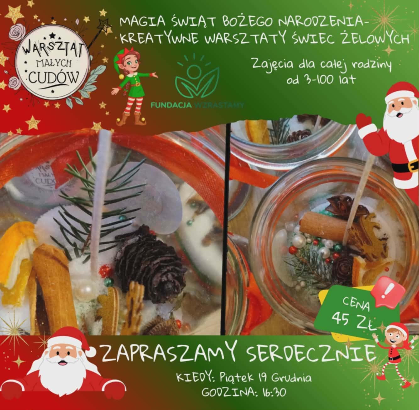WZRASTAMY - Centrum rozwoju i wsparcia Piłsudskiego 9, Siedlce, mazowieckie, PolandWarsztat Małych Cudów 🎅Kreatywne Warsztaty Świec Żelowych dla całej rodziny - MAGIA ŚWIĄT 🎅 Na naszych warsztatach świec żelowych stworzysz własną świąteczną kompozycję pełną MAGII ŚWIĄT, zamkniętą w szklanym słoiczku. 🎅Dlaczego warto przyjść? Warsztaty tworzenia świec żarowych to przede wszystkim: 🎄Rozwijanie kreatywności i wyobraźni poprzez tworzenie własnych kompozycji świec żelowych. 🎄Kształtowanie umiejętności manualnych i precyzji podczas pracy z różnymi materiałami....