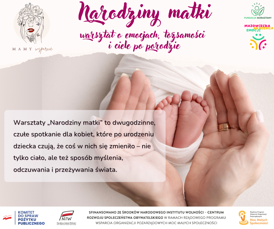 🌸🤱 Narodziny matki – o emocjach, tożsamości i ciele po porodzie 🤱🌸 Warsztaty dla kobiet z województwa mazowieckiego Warsztaty „Narodziny matki” to dwugodzinne, czułe spotkanie dla kobiet, które po urodzeniu dziecka czują, że coś w nich się zmieniło – nie tylko ciało, ale też sposób myślenia, odczuwania i przeżywania świata.   🌹Podczas warsztatów : ✅ przyjrzymy się psychologicznym i emocjonalnym zmianom,...