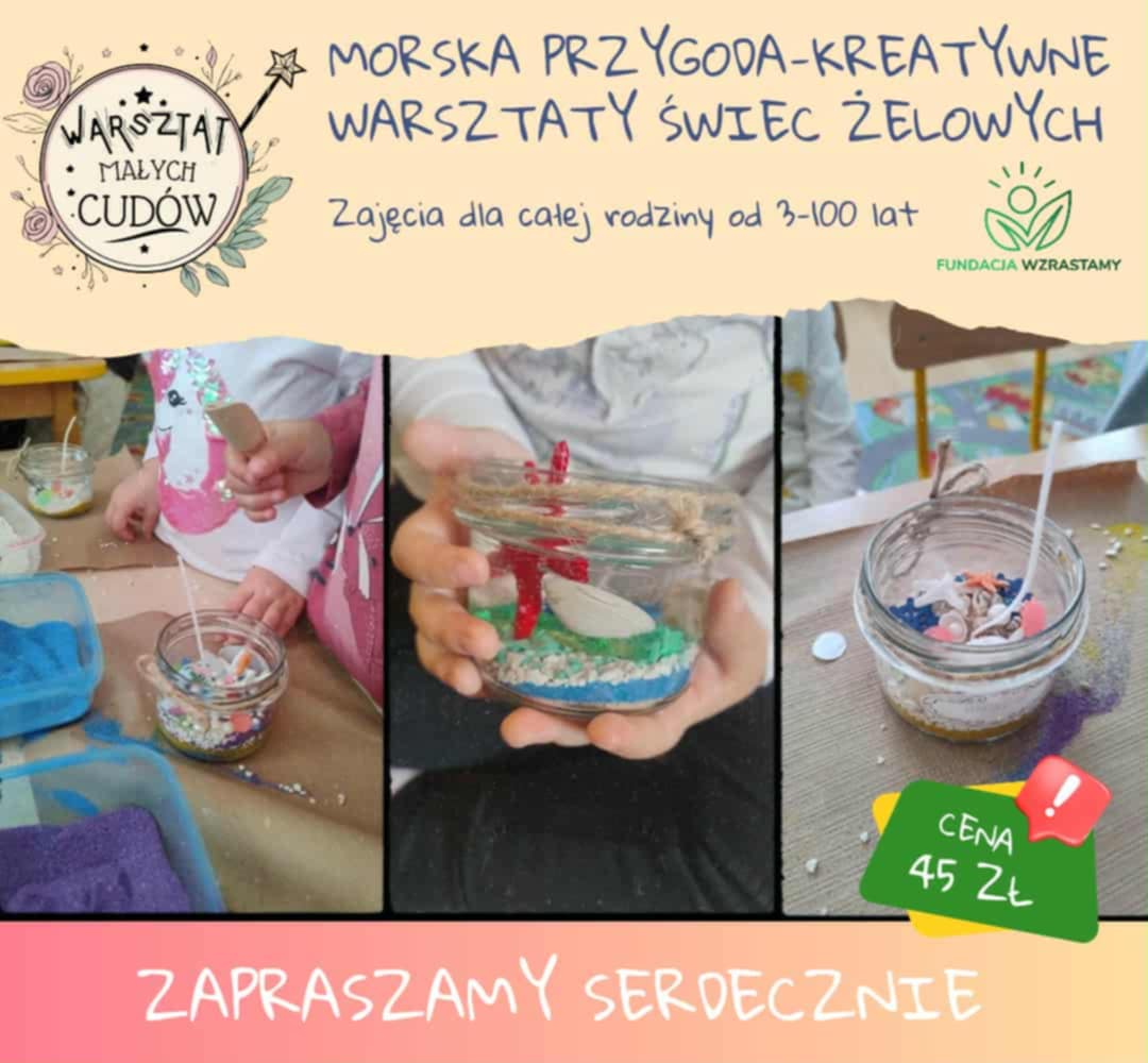 🌞🐬 Morska Przygoda - Kreatywne Warsztaty Świec Żelowych dla całej rodziny od 3 - 100 lat👶🐙 Na naszych warsztatach świec żelowych stworzysz własną morską kompozycję: muszelki, piasek, kwarc, inne kolorowe ozdoby oraz zapach lata zamknięty w szklanym słoiczku. 🐙🌞  Dlaczego warto przyjść? 🌞 Warsztaty tworzenia świec żarowych to przede wszystkim: ​ 🌞Rozwijanie kreatywności i wyobraźni poprzez tworzenie własnych kompozycji świec żelowych....