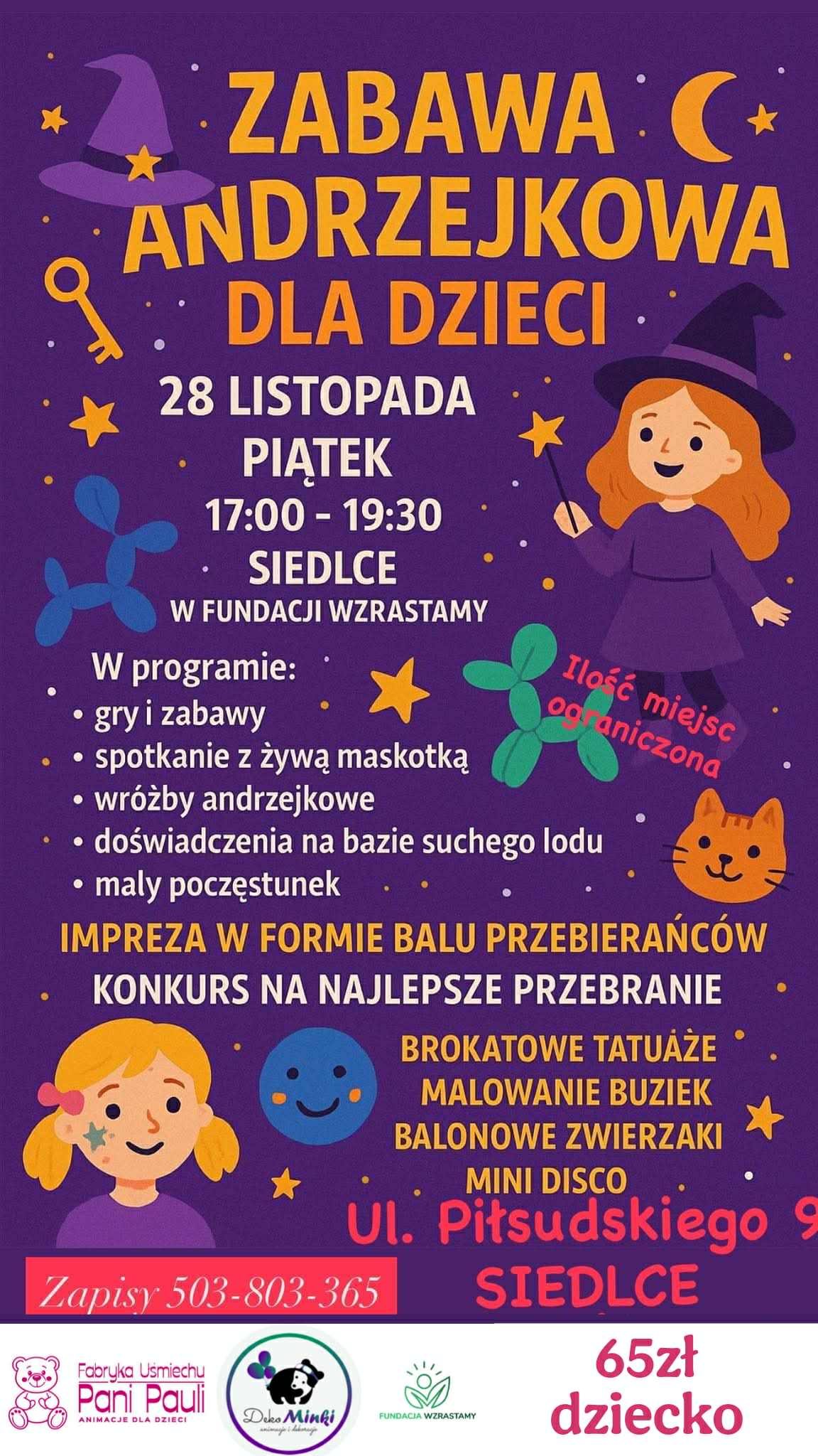 Zabawa Andrzejkowa dla dzieci 28.11.2025 godz. 17:00  ZAPISY RUSZYŁY Mamy przyjemność zaprosić wszystkie dzieci na imprezę jakiej jeszcze nie było HIT- Tego jeszcze nie było, czyli Mega zabawa w chmurach ciężkiego dymu  W programie między innymi Gry i zabawy z animatorami Poczęstunek Spotkanie z żywą maskotką Wróżby Andrzejkowe Doświadczenia na bazie suchego lodu Fotorelacja Zabawy w chmurach ciężkiego dymu Mini discoKonkurs na najlepszy strój AndrzejkowyOraz wiele innych...