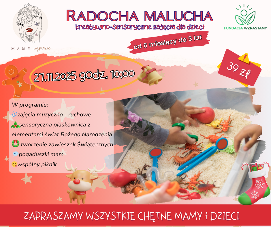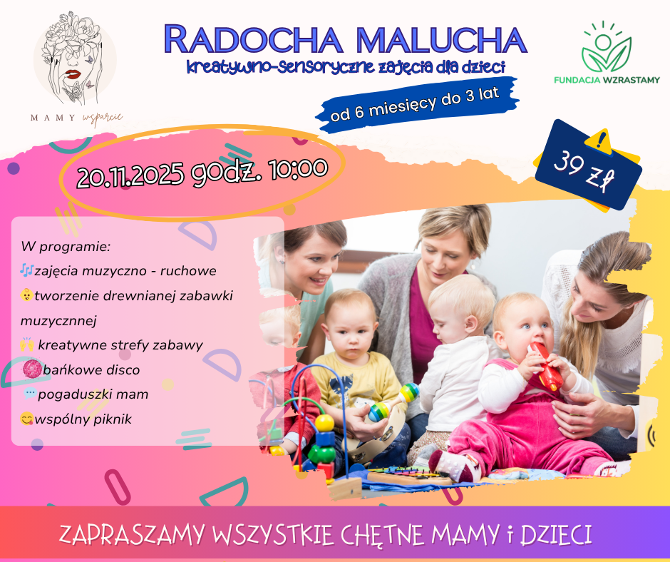 RADOCHA MALUCHA -  zabawy kreatywne, ruchowo - sensoryczne wśród rówieśników 👶🧒👶 Serdecznie zapraszamy wszystkie chętne Mamy z najmłodszymi dziećmi w wieku od 6 miesiąca do 3 roku, na zajęcia ogólnorozwojowe. Nasze zajęcia dla najmłodszych zostały zaprojektowane z myślą o wszechstronnym rozwoju dzieci w wieku do 3 lat. Skupiamy się na tym, aby poprzez zabawę i interaktywne aktywności wspierać rozwój ruchowy,...