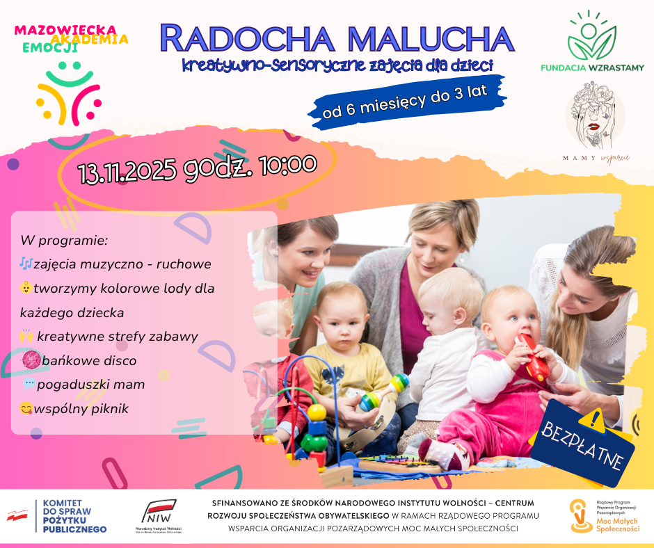 Serdecznie zapraszamy wszystkie chętne Mamy z najmłodszymi dziećmi w wieku od 6 miesiąca do 3 roku, na zajęcia ogólnorozwojowe. Nasze zajęcia dla najmłodszych zostały zaprojektowane z myślą o wszechstronnym rozwoju dzieci w wieku do 3 lat. Skupiamy się na tym, aby poprzez zabawę i interaktywne aktywności wspierać rozwój ruchowy, sensoryczny, poznawczy i społeczny maluszków.