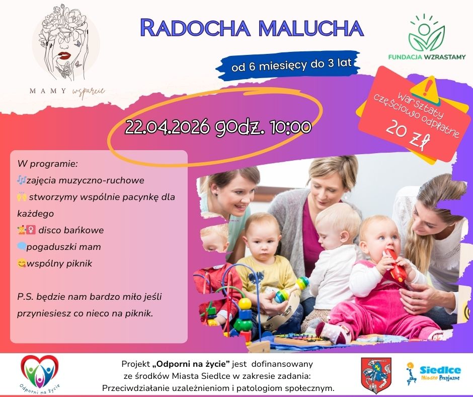 Serdecznie zapraszamy wszystkie chętne Mamy z Siedlec z najmłodszymi dziećmi w wieku od 6 miesiaca do 3 roku, na zajęcia ogólnorozwojowe. Nasze zajęcia dla najmłodszych zostały zaprojektowane z myślą o wszechstronnym rozwoju dzieci w wieku od 0 do 3 lat. Skupiamy się na tym, aby poprzez zabawę i interaktywne aktywności wspierać rozwój ruchowy, sensoryczny, poznawczy i społeczny maluszków. Gwarantujemy super zabawę w towarzystwie rówieśników. To świetny moment na oswojenie dziecka z grupą rówieśniczą przed podjęciem nauki w żłobku czy przedszkolu.